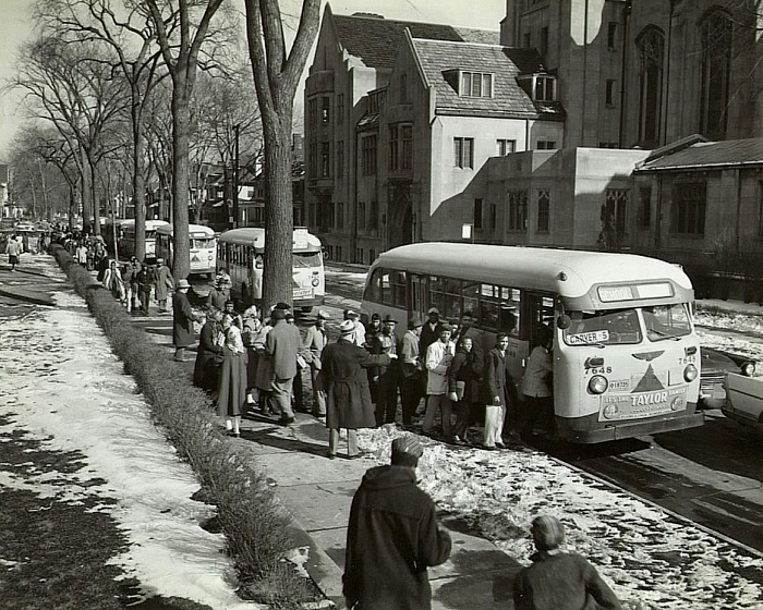 Although school-busing in Detroit was turned into an ugly word during the 1970s, busing children long distances to school had been a long-time practice in the city of Detroit. During the post-war years, when the city's population was approaching nearly two million, Detroit bused over 5,200 children from fast-growing areas of the city to older areas where space was still available. In the above photo, taken in September, 1949, lead coach #3190 was one of 17 bus loads of DSR Ford Transit Buses used to transport children to (Phillip) Tappan Intermediate School, located at American and Elmhurst streets on the city's west side. The children can be seen here exiting DSR buses along American, between Tuxedo and Webb streets. (Photo courtesy of the Sept. 19, 1949 edition of LIFE Magazine — see online version) |
