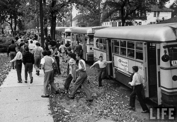 At first I was thrown off course by the signs "CARVER" which were displayed in the windows of the buses. Realizing that the African-American students visible in this photo obviously appeared to be of high-school age, I first began searching for the location of a former "Carver" High School in Detroit. I figured the sign identified the school the students attended, and if I could just locate Carver High, then everything else in this photo would fall right into place. Oh boy, was I way off track!!