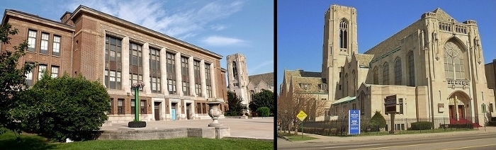 Although not pictured in the main photo above, Detroit's Northern Senior High School (located at 9026 Woodward at Holbrook) accepted black students bussed cross-district from Royal Oak Twp. during the 1950s. The right photo shows the Historic Little Rock Baptist Church, which back then was known as Central Woodward Christian Church. (pinehurst19475 photos) |