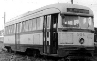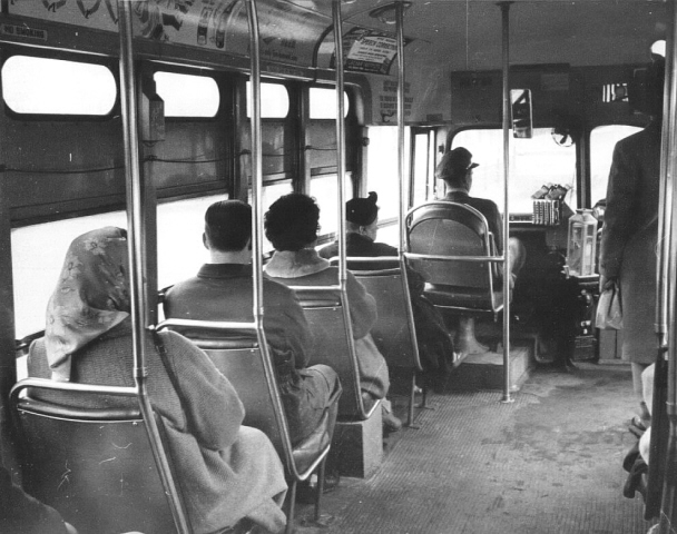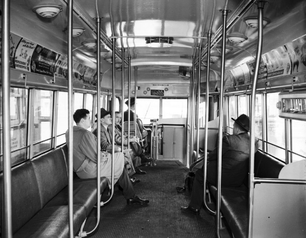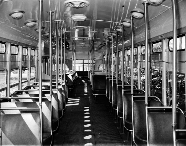 The two photos below show the typical interior and seating arrangement of the PCC cars delivered in both 1947 and 1949. These cars came equipped with "standee" windows for standing passengers. Instead of the perimeter seating used at the front of the two demonstrator cars, these cars used single forward-facing seats on the left-side of the car. Both photos are of the PCC fleet delivered in 1949, which used lift-operated passenger windows instead of the crank handles used on the previous fleets. |
