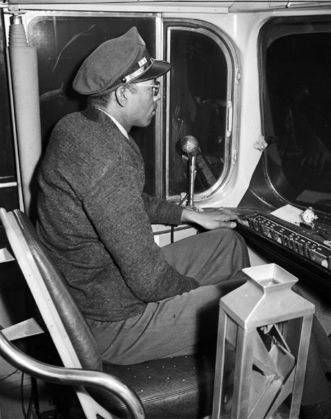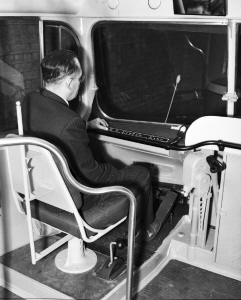In this December, 1945 photo, a DSR streetcar motorman can be seen at the controls of a new PCC streetcar. A control board located on the dashboard in front of the motorman contained the gauges and switches used to operate the doors, interior lights, exterior lights, etc. (Photo #48409_3 – Walter P. Reuther Library, Wayne State University photo) |