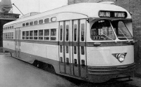 Upon entering the new PCC cars, Detroiters would first notice that the motorman's cab was positioned differently than the older Peter Witt style streetcars that had been operating on Detroit streets since 1921. On the older cars (left photo) the motorman was stationed in the center of the cab and had to stand or sit on a stool. He would accelerate and stop the vehicle through the use of a waist-high hand-operated controller box located to the left of the motorman. In the PCC streetcar (right photo), the motorman was positioned to the left and sat in a seat, much like a bus operator. Acceleration and braking was controlled by foot-operated pedals. (Photo #28490_1 (left) and #48409_2 (right) Walter P. Reuther Library, Wayne State University photos) |