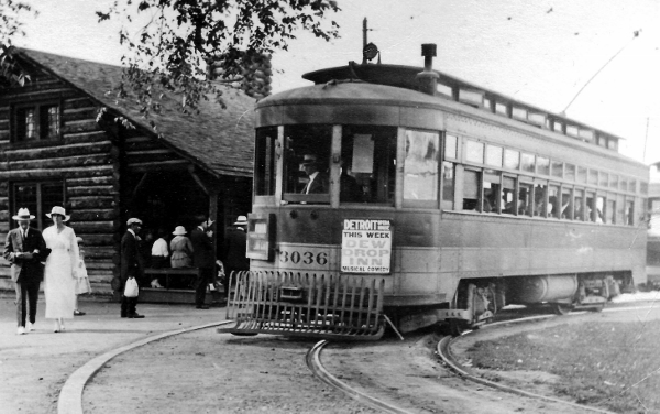As part of the 1921 "Day-to-Day" trackage purchase, the MO acquired 105 large-size Double- Truck Steel Body Cars from the DUR. Seventy-nine of these 46-passenger cars (#3021-3099) were built by the Kuhlman Car Company between 1915–1917, and became part of the MO fleet on Dec. 23, 1921. In this August 1917 photo, car #3036 (at that time owned by the DUR) can be seen at the Log Cabin Loop turn-around in Palmer Park at the north end of the Woodward line, where the DUR had erected a log cabin style waiting station just east of the Thomas W. Palmer Log Cabin—which in that day was a major summertime Detroit tourist attraction and museum. [photo courtesy of the R. W. Jackson estate, donated to website by Sandy Jack] |