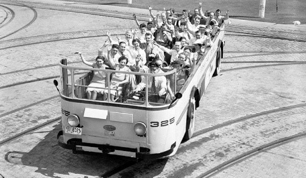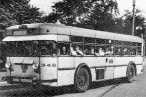 After the ex-Detroit Motorbus (Model 40) Twin Coaches were retired, eight of the coaches had their tops removed and converted into "Fresh Air Cruisers." A total of ten cut-down Twins were used for special charters and 25¢ evening tours around Belle Isle. This Aug 1939 photo shows coach #325 (former DMB coach #1031) now operating as a cut-down fresh air cruiser. [Walter P. Reuther Library, Wayne State University photo #48423 — used with permission] |