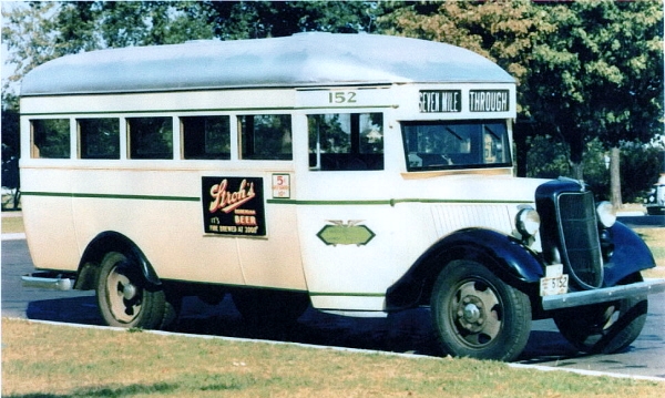The above photo shows coach #152 — one of the last 100 conventional-type Fords (#151-250) delivered in late 1935 — while at work on the Seven Mile route. The 5-cent fare displayed on the side of the coach was instituted in 1935 on bus routes that did not travel downtown. |