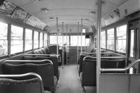 This photo shows the interior view of a DSR 27-passenger rear-engine Ford Transit Bus. Some of the interior features promoted by Ford included 20-22 inch wide aisles, two-step entry and exit doors, 165 sq. ft. total floor space, a two-unit fresh air/hot water heating and ventilating system, and ribbed linoleum flooring along the aisle and steps. The primary interior color was a standard pea-green color commonly used on the Fords, Transits and Checkers that followed. [site-owner's collection photo, courtesy of the Schramm photo collection] |