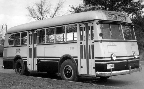 The first of the low-cost conventional Ford buses—at $2,180 apiece—came equipped with Ford Model BB-18 truck chassis with 80-hp V-8 engines, and hydraulic brakes. A hand-operated door control was used to open the front door. Excess buses from the original order were also used on the Lafayette-Green line. In addition to an ex-demo (#836) obtained later in 1934, a second fleet of 60 coaches (#837-896) were purchased in early 1935 at $1,973 apiece, and were placed into service on the Fourteenth bus line. These buses were mounted on Ford Model 51 truck chassis with 85-hp V-8 engines. Proving to be a great success, additional Fords were on the way. [photo courtesy of the Carl D. Dutch photo collection] |