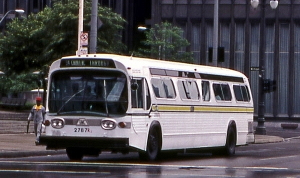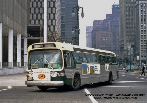 | The above photo, taken in October of 1971, shows coach #2791 south along Woodward Avenue turning onto Jefferson Avenue while working the Mini-Loop #1 route in downtown Detroit. The #2700-series coaches were the last fleet of DSR buses purchased directly by the City of Detroit, and the last bus fleet purchased during the 1960s. The department's next fleet of coaches would be purchased through the regional transit authority SEMTA in 1971. [Gerald Squier photo, courtesy of the James Husing Collection — see disclaimer below] |