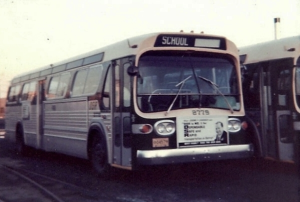 | Another feature unique to the #2700-series "New-Looks" was the air-operated seat adjustment control feature located on the operator's seat. Unfortunately, many of the operators didn't like the continuous up-and-down motion the seats would give. These seats were eventually replaced. The above photo of coach #2779 was taken by current SMART employee Stan Sycko at the Highland Park Terminal back in October of 1968, shortly after the fleet was placed into service. [photo courtesy of the Stanley Sycko photo collection] |