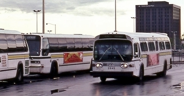 After the arrival of the GMC RTS-IIs in 1978, DDOT began repainting a significant number of its buses—all patterned after the RTS horizontal yellow and green stripe design. One of the first DDOT fleets to begin sporting this new paint scheme were the #2800-2900-series New-Looks. In this 1981 photo, coach #2845 sports the new livery at the Northland Mall loop. Although a large number of the T8H-5307As were repainted, only about a dozen were completely rehabbed. [photo courtesy of the Clifford Kuhl collection, used by permission of Clifford Kuhl] |