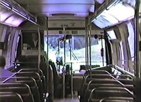 | Although not the best image, this video-still shows the interior rear view of a #1500-1600 series D-DOT RTS-II coach. Just like their predecessors, this fleet also came with those cantilevered wall-mounted fiberglass seats, which, unfortunately, rattled considerably when the coach was empty. In addition to the wheel-chair lift equipment located at the rear door, black was now used on the rear wall panels around the rear seats instead of the white used on the #1300-series. [Video still image captured from website-owner's video tape collection] |