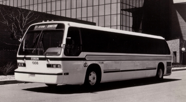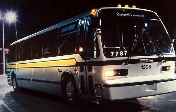 | A night light view of DDOT RTS coach #1308. The odd looking "Detroit Limited" sign displayed in the destination sign window suggests that the roll sign was altered for promotional purposes. [photo source: online – unknown (unidentified) photo collection] |