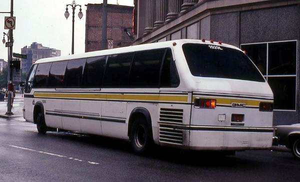 | The RTS coach, at the time it was launched, was noted for its futuristic streamlined styling and large tinted window panels. One advanced feature of the RTS was its modular construction design, where 5-ft long stainless steel modules were welded together to form one complete body. The only notable external identifying feature change on the "Series 03" was the front bumper, which on the Series 01 model was more flush to the body with no place for a front license plate. [GMC promotional photo courtesy of the Carl D. Dutch photo collection] |
