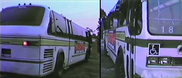 | These video-still images (also from August 1981) show two exterior views of D-DOT RTS coach #1574L. In left photo, the original sloping rear roof-line of the RTS is clearly visible, while a small SEMTA logo decal can be seen displayed next to the transmission access door. In right photo, the old style (manually-turned) run number sign can be seen displayed in the windshield. [Video still images captured from website-owner's video tape collection] |
