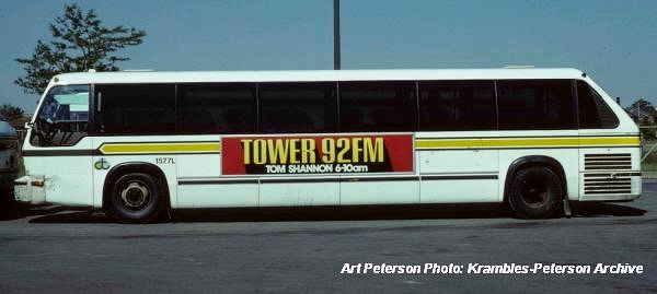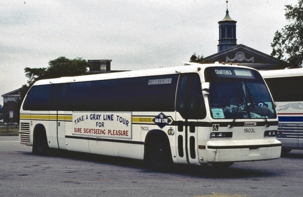| A number of features unique to the first (1978) RTS fleet—such as the large out-side "elephant- ear" mirrors and a front-door interlock feature—were absent on this second fleet. In the above 1982 photo, it appears that coach #1603L (parked at Greenfield Village in Dearborn, MI) had now been reserved for V.I.P. Chartered Service, including Gray Line Sightseeing Tours. [Edward Gibbs photo, courtesy of Melvin Bernero photobucket.com collection] |