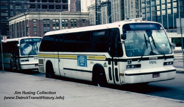 | In August 1977, the Southeastern Michigan Transportation Authority (SEMTA) had placed an order for 189 new GMC RTS coaches at a cost of more than $18.2 million. Funding for the buses was financed 80% by the U.S. Dept. of Trans. and 20% from state grants. SEMTA retained 78 of the buses (#1801-1878) for its suburban operation, while 111 were leased to the city of Detroit for $1.00 a year. Fifty-seven coaches from that order also came equipped with hydraulic wheel- chair lifts—with sixteen (#1863L–1878L) kept by SEMTA for route #560 Gratiot. The SEMTA fleet came equipped with 46 large cushioned seats and no rear exit doors on its non-lift coaches. [Melvin Bernero photobucket.com collection, used by permission of Melvin Bernero] |