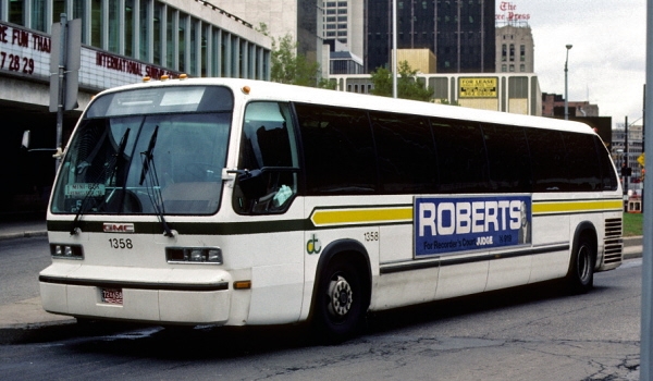 | The first RTS-IIs to begin service in Detroit were 70 D-DOT coaches (#1300-1369) assigned to the Coolidge and Gilbert Terminals, which began service on Monday, June 26, 1978. Many new features included large tinted impact resistant acrylic windows, sturdy fiberglass wall-mounted seats, automatic temperature control, graffiti-resistant fiberglass exterior panels, and a unique "kneeling" feature which permitted the bus to be lowered, making entrance and exit easier for handicapped and elderly persons. These 40' long, 102" wide coaches seated 47-passengers and came equipped with 8V-71 Detroit Diesel engines. Coach #1358 is parked at Cobo Hall in 1978. [Melvin Bernero photobucket.com collection, used by permission of Melvin Bernero] |