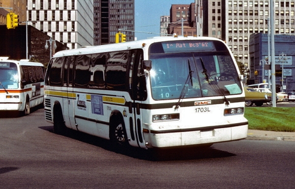 | In early 1980, DDOT began experimenting with the "Transdot" destination sign by testing them on three RTS 35-footers; coaches #1701, 1702 and 1703. In this September 1981 photo, coach #1703L is turning east onto E. Jefferson from Woodward while working the Mini-Loop #1 route. Although the computerized route sign on coach #1703L appears here to be in transition mode, the digital "Transdot" sign on coach #1701L in the previous photo clearly reads: 1 MINIBUS #1. [Melvin Bernero photobucket.com collection, used by permission of Melvin Bernero] |
