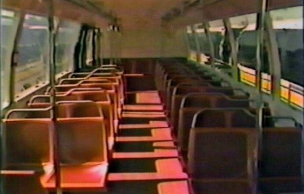 | This August 1981 video still-image shows the interior front view of D-DOT RTS coach #1574L. While all of the interior plastic—including window posts, upper panels, and ceiling—was mostly white, the front dash and floor was a burnt-orange rust color. Beginning with the #1500-series and following, a charcoal color was used on the front windshield posts. On the #1800-series delivered in 1980, a light-gray color replaced the white on the window posts and upper panels. [Video still image captured from website-owner's video tape collection] |
