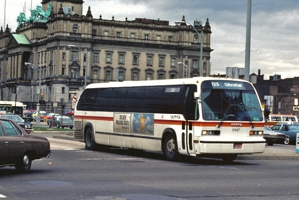 | All of the GMC built RTS coaches purchased for DDOT were delivered sporting the original RTS "sloping-back" design, as seen in this 1981 photo of coach #1529L; northbound on Woodward Avenue at Cadillac Square in downtown Detroit. A number of the minor issues affecting GMC's first fleets of RTS-IIs had been resolved by GM in this second order. However, the RTS coach would continue to be plagued by reliability issues, such as suspension and overheating problems and frequent air-conditioning failures—which had to be resolved during the early 1980s by the installation of an improved A/C condenser unit that would greatly alter the coach's appearance. [photo courtesy of the Clifford Kuhl collection, used by permission of Clifford Kuhl] |