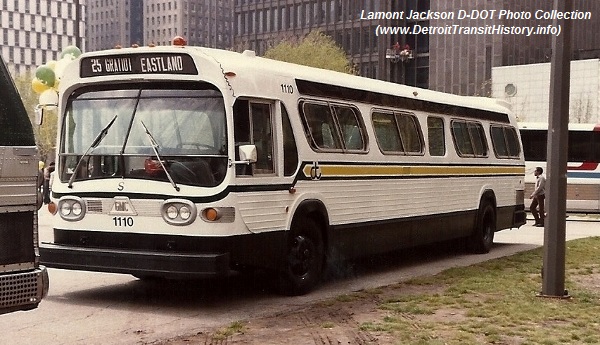 Around 1988, DDOT would launch its new revised paint scheme. Although up to 150 coaches (including 12 of the #28-2900-series T8H-5307As–built in 1972) had been contracted out for major rebuilding, most of this new repainting was done at the new Rehab Center. In this photo, rehabbed coach #1110 is seen sporting its redesigned "black-bottom" paint scheme while parked at the Kern Block during a National Transportation Week display. Also note the former DSR replacement sign-curtain now being used in coach #1110 that displays route "#25 GRATIOT." [Lamont Jackson photo courtesy of the L. Jackson D-DOT photo collection] |