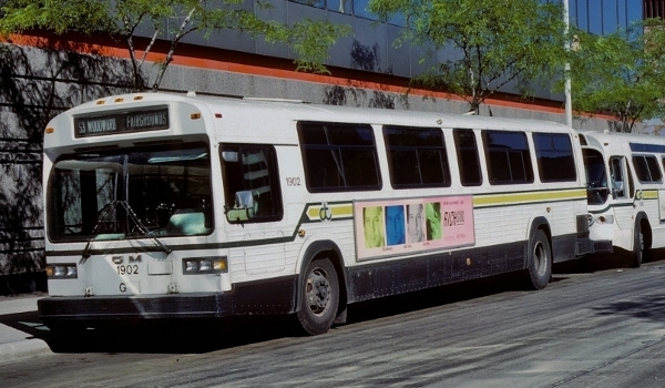 Between Aug–Sept 1986, the first 25 of these 49-passenger coaches (Model TC40-102N) were delivered to DDOT from the GMDD plant in Saint-Eustache (Montreal), Quebec. The first group (all non-wheelchair equipped) arrived out of numbering sequence; #1900-1910, #1934-1940, and #1968-1974. The "Classic" model features that most impressed DDOT officials included the increased visibility through the larger passenger windows and the wider front doors not offered on the New-Look design. In this June 5, 1991 photo, coach #1902 (one of the first 25 delivered) can be seen laying-over on Beaubien at E. Jefferson while working the #53 Woodward line. [Jim Beeler photo, courtesy of Melvin Bernero photobucket.com collection] |