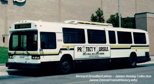 Still on an anti-RTS campaign, and with federal funds now available again to buy new buses, DDOT would purchase 85 more "Classic" coaches (#2000-2084), this time from Motor Coach Industries (MCI), which purchased the Classic transit bus design from General Motors in 1987. Although the MCI "Classic" bus design was basically identical to the GMDD design, the DDOT #2000-series fleet would come equipped with many more additional features than the previous #1900-series GM coaches. In this June 27, 1990 photo, DDOT coach #2009 can be seen laying- over at the Fairlane Mall Shopping Center in Dearborn while working the #22 Greenfield line. [Bernard Drouillard photo, courtesy of the James Husing Collection — see disclaimer below] |