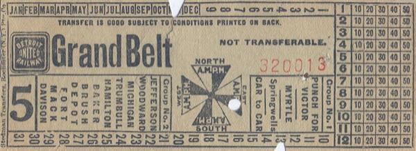| A typical "free" Grand Belt streetcar transfer issued during the Detroit United Railway (DUR) years. (Transfer courtesy of the Stan Sycko collection) |