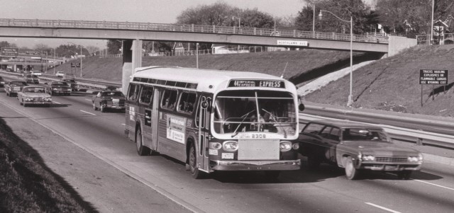 | In this 1968 photo, DSR coach #2308 is southbound along the John C. Lodge Expressway at Northlawn Ave while working the Imperial Express. Coach #2308 was one of twenty "air-conditioned" GM model TDH-5303 3-speed transmission buses (#2301–2320) delivered in early 1966 that were used for high-speed expressway operation. |