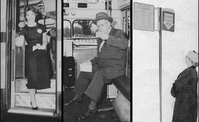 | left photo: Hostess Shirley Delorme welcomes riders on the first day. center photo: Mayor Miriani sips milk on inaugural bus. right photo: Metal schedule signs were erected along W. Seven Mile at all transfer points between Inkster Road and Greenfield. (photos courtesy of the DSR Reporter – May-June 1958 edition) |