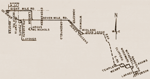 However, also effective that day, a few peak-hour trips were routed to Eight Mile Road and Grand River. This service would branch off Seven Mile Road at Lasher and run north to Eight Mile, then west to Inkster Road, looping at Grand River. This branch operation was the result of the Imperial Express replacing portions of the Eight Mile West bus line, which was also discontinued on Sept. 7, 1966. In addition, some morning and afternoon trips were operated as a shuttle service, following the entire Eight Mile West route, from McNichols and Lahser, via Lahser and Eight Mile Road to Grand River. Two 5¢ zone fares were also collected along Eight Mile Road, outside the city limits.