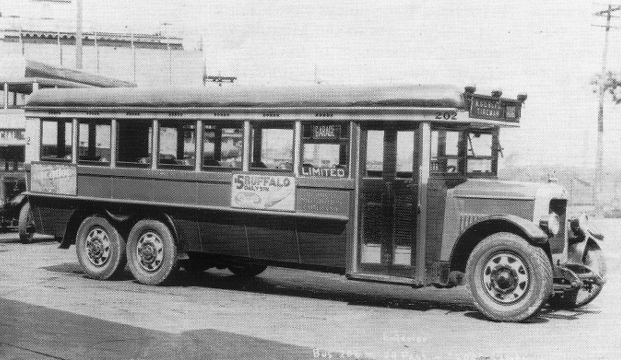 | Detroit Motorbus Co. coach #202—pictured here displaying its "W. GRAND BLVD.-TIREMAN" route sign—is representative of the early type "single-decker" coaches the company used on its Tireman line. Nineteen of these 33-passenger Safeway Six-Wheel Company coaches (#201-219) were delivered between 1924-25. (Photo source: Motor Coach Age Magazine – Sept. 1988 edition) |