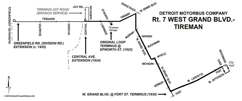 Meanwhile, beginning on April 3, 1923, a new Rt. 7 – West Grand Blvd.-Tireman line began providing service from the old City Hall (located at Woodward and Fort Street downtown) to the company's new Tireman Garage, where a bus loop had been built on the property. The route left downtown via Lafayette, W. Grand Blvd., and Tireman to Epworth Street. In 1924, the route was extended one mile westward, looping at Central Avenue near the old city limits. After additional territories were annexed to Detroit in 1926, the line was extended 2½-miles west to Division Road (renamed Greenfield (c. 1930)).