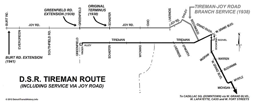 However, this confusion would only last less than one year, for on March 13, 1949, the situation was resolved. The recently renamed Myrtle line—which basically traveled from City Hall via Fort, Third, Grand River, Myrtle, W. Grand Blvd and Tireman to Greenfield—was renamed the "Tireman" line, while the former Tireman-Joy branch (recently renamed Tireman)—which basically traveled from Cadillac Square via Fort, Lafayette, W. Grand Blvd., Tireman, Beechwood and Joy Road—became the new "Joy Road" line. These changes launched the two bus routes that exist today.