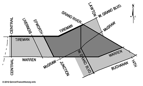 | Route map of the W. GRAND BLVD.-TIREMAN bus line when operated by the Detroit Motorbus Co. between 1923-1932. (Map edited by H.B.Craig,II) |