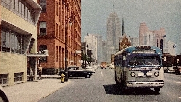 | After the new owners took over Dearborn Coach Co. in 1946, the decision was made to begin standardizing the bus fleet with GM diesel buses. Between 1947 and 1957, the company would purchase 110 various-size models of GM 'Old-Look' diesel coaches (#101-210). In this GM Truck & Coach promotional photo, Intertown Suburban Lines coach #140 — a 1954 GM Model TDH-4512 — is headed west on Fort St. at Sixth while sporting the Intertown Suburban colors. [photo courtesy of the Samuel Braxton Jr. Bus Photo Collection] |