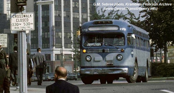 | Metropolitan Transit coach #179 was one of ten 35-foot long, 96-inch wide, 45-passenger Model TDH-4512s (#171-180) initially delivered to Intertown Suburban Lines in Feb. 1956. It's pictured here in this Aug 1969 photo south on Randolph at Congress displaying a "VETERANS HOSPITAL" sign and en route to the Veterans' Administration Hospital in Allen Park. All of the GM 'Old-Looks' were already retired when SEMTA took-over Metro Transit on Jan. 1, 1974. [photo courtesy of the Krambles-Peterson archive collection: G. Mac Sebree photo] |