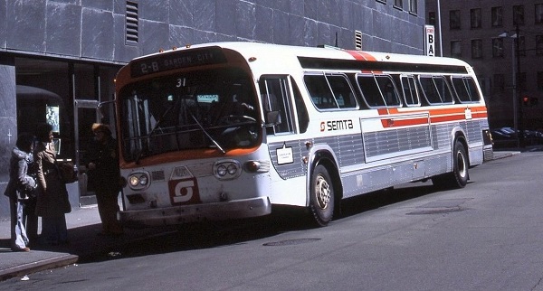 | Coach #31 — a Model T6H-5305 (third generation) GMC "New-Look" delivered to Metropolitan Transit in Dec. 1968, can be seen here sporting the new SEMTA colors while working former Metropolitan Transit route #2-B Garden City-Westland. One of eight coaches purchased in 1968 (#29-36), these would be the last 40-foot coaches to be purchased by Metro Transit. [photo source: online – unknown (unidentified) photo collection] |