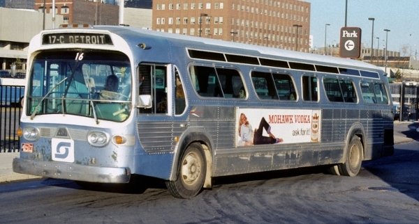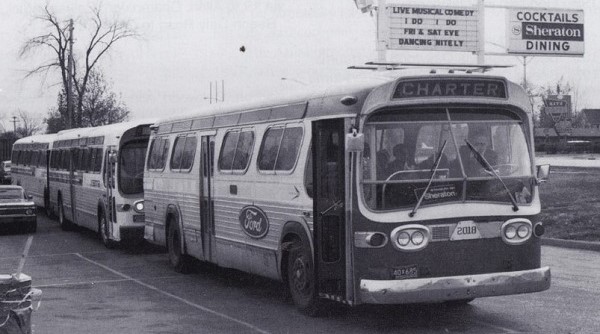 | Coach #2018 — one of two TDH-4519s (#2018-2019) delivered in July 1967 — is seen here still sporting its Ford blue oval logo a few years after the SEMTA take-over. For a number of years, FoMoCo chartered Metro Transit buses to transport tourists along the Ford Rouge Factory Tour route from Greenfield Village, and also shuttled workers within the plant. Notice that the GM nameplate on these buses had been replaced by the coach number with the Ford logo bolted along the side — more than likely an attempt to remove any identification associated with GM. [Photo courtesy of MCA (Oct-Dec 2002 issue) used for educational purposes] |