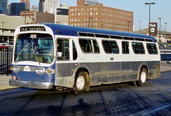 | Coach #15 was one of five GM Model TDH-5303s (#14-18) delivered to Metro Transit in May 1965. In this Nov. 1978 photo, it is still sporting its Metro Transit colors four years after Metro had been purchased by SEMTA. All 36 of the 40-foot GM TDH-5301s, TDH-5303s and T6H-5305s purchased by Metro Transit between 1962 and 1968 were assigned numbers #1-36. [Melvin Bernero photobucket.com collection, used by permission of Melvin Bernero] |