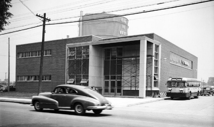 This Detroit News photo from June 22, 1948, shows the new $199,800 Coolidge Terminal office building nearing the final stages of construction as part of an extensive $2.6 million DSR modernization and rehabilitation project. Also visible is the "Gas is Best!" natural gas reservoir in the distant background. These huge structures were once a common sight in Detroit. (Walter P. Reuther Library, Wayne State University photo #29982 — see disclaimer below)