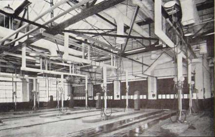 The original Coolidge coach service garage is seen here in this 1938 photo after having recently undergone an extensive remodeling and expansion program. After the garage was "streamlined" the facility was able to service up to 500 buses. The garage was later demolished in 1947 to make way for new modern buildings.