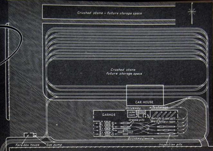 The above 1938 photo shows the remodeled coach service area which was equipped with five banks of fuel, oil and water pumps, all "metered." New overhead electrically-operated doors were also installed to insure high speed servicing.