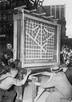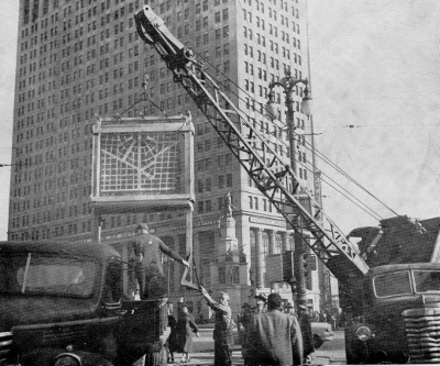 These two photos show a DSR crew at work installing the huge electric sign at Campus Martius in downtown. The left photo shows the sign being swung into position by the DSR crane, while the right photo shows the crew guiding the sign into place onto a temporary wooden supporting framework. (Photos courtesy of the April 1955 edition of The DSR Reporter – An Employee Publication) |