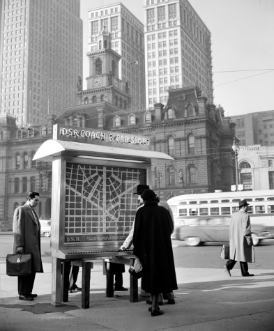 Built in house, at the DSR Coolidge Terminal, the seven-foot high illuminated display sign was encased in a shiny aluminum frame with a huge map displayed on each side. Each map was dotted with 244 small lights operated by 38 push buttons. These lights would light up to indicate all of the loading zone points on the map that corresponded to the individual route selected by a would-be patron. The unit was topped by a copper-colored neon sign that read "DSR Coach & Car Stops." According to the April 1955 edition of The DSR Reporter (a monthly employee newsletter), almost a half mile of wiring was used to hook up the push buttons and light sockets.