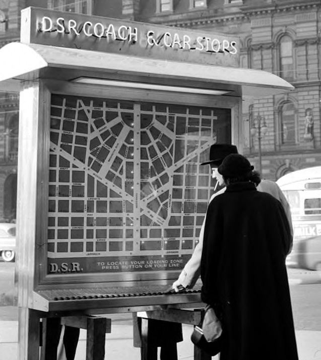 Back in March of 1955, the Detroit Department of Street Railways (DSR) unveiled its own 1950s version of a modern day kiosk with the installation of its Service Robot Information Machine. This large electric illuminated "stop-finder" map — located in Campus Martius in Downtown Detroit — would show the perspective rider, at the push of a button, where to locate a downtown loading station for any DSR coach or car line. The rider could find their bus or streetcar loading zone by just pressing the button of the desired line and the corresponding downtown stops for that line would be illuminated on the large map.