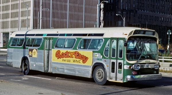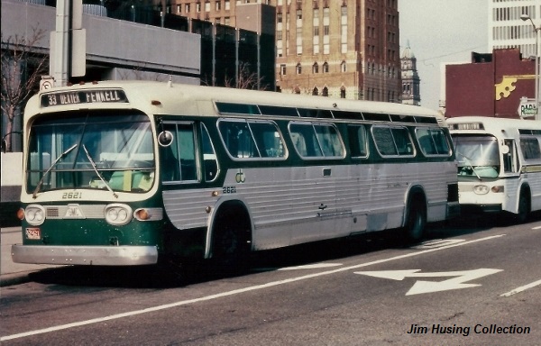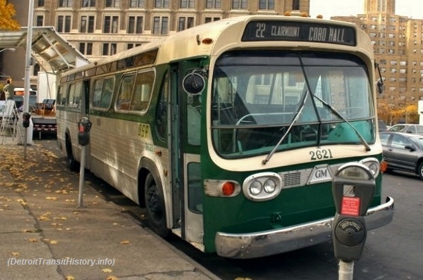 | In this early-1980s photo, coach #2621 can be seen in service on the Dexter line while laying- over on Jefferson Ave near Shelby St. Since being retired, coach #2621 has made a few brief cameo movie appearances, including the 1992 film "HOFFA" (starring Jack Nicholson)—about the life and mysterious death of Teamsters Union leader Jimmy Hoffa; and in the 2012 musical film "SPARKLE" (starring Jordin Sparks, Whitney Houston, Mike Epps) set in 1960s Detroit. [Jim Husing Collection photo, courtesy of James Husing — see disclaimer below] |