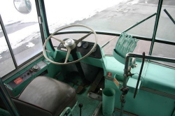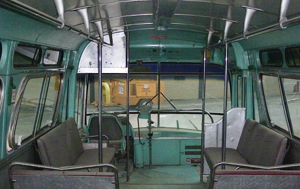 | This interior photo of #2621 was taken a few years before the coach was spruced-up. Although the coach was quite dusty when this photo was taken, it does give us a view of the front interior and driver's compartment areas of a typical DSR GMC "New-Look" bus from back in the day. [H.B.Craig,II photo collection (Dec. 2004) — www.DetroitTransitHistory.info] |