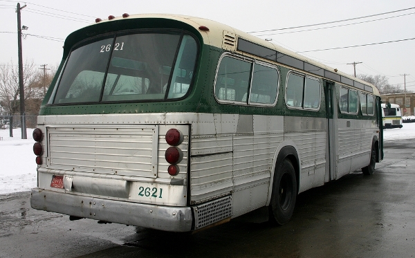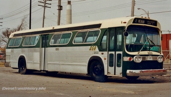 | Although the last of the #2600-series GMC T6H-5305s were retired in 1988, one coach from that 1968 fleet still lives on today! Former DSR coach #2621 (Model T6H-5305 – serial #049) has been refurbished, repainted, and preserved by the Detroit Department of Transportation and is currently being stored at DDOT's east-side main heavy repair shop facility. [website owner's collection photo, courtesy of the Schramm photo collection] |