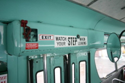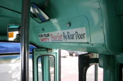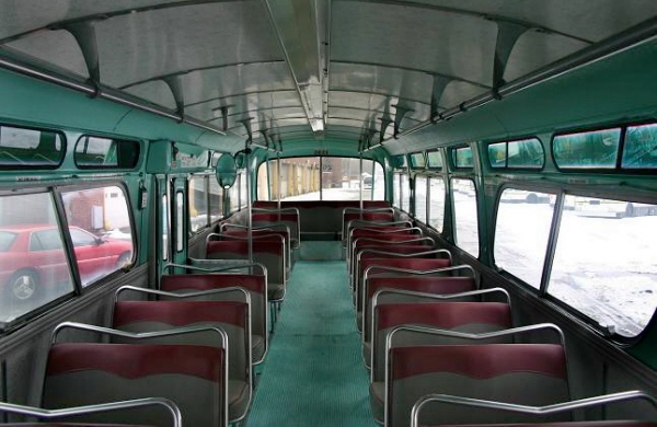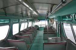 | The interiors of the DSR GM New-Looks purchased during the 1960s used various shades and combinations of green. It wasn't until the arrival of New-Look fleets during the 1970s that the interior color schemes parted from the usual green decor. However, the #2600-series GMs were the first Detroit buses to arrive with the redesigned seating style seen here in #2621, and were the last ones to be purchased with the optional four-piece "jackknife" folding rear door. [photo courtesy of the Michael Koprowicz Photo Collection] |